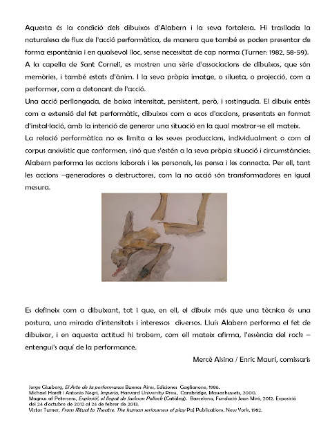 A la capella de Sant Corneli, es mostren una sèrie d’associacions de dibuixos, que són memòries, i també estats d’ànim. I la seva pròpia imatge, o silueta, o projecció, com a performer, com a detonant de l’acció. Una acció perllongada, de baixa intensitat, persistent, però, i sostinguda. El dibuix entès com a extensió del fet performàtic, dibuixos com a ecos d’accions, presentats en format d’instal·lació, amb la intenció de generar una situació en la qual mostrar-se ell mateix. La relació performàtica no es limita a les seves produccions, individualment o com al corpus arxivístic que conformen, sinó que s’estén a la seva pròpia situació i circumstàncies: Alabern performa les accions laborals i les personals, les pensa i les connecta. Per ell, tant les accions –generadores o destructores, com la no acció són transformadores en igual mesura. Es defineix com a dibuixant, tot i que, en ell, el dibuix més que una tècnica és una postura, una mirada d’intensitats i interessos diversos. Lluís Alabern performa el fet de dibuixar, i en aquesta actitud hi trobem, com ell mateix afirma, l’essència del rock – entengui’s aquí de la performance.