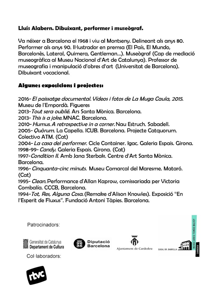 La primera mostra està dedicada a Lluís Alabern. Com expliquen els comissaris, “històricament, la intensificació de les pràctiques performatives s’ha produït en escenaris de crisi, i el treball d’Alabern s’inscriu en la fallida del sistema financer que es produeix a partir dels noranta amb la globalització. Un procés, però, que és tanmateix una condició per a l’alliberament de la multitud, en tant que produeix subjectivitat i desig en aquesta. La pregunta a fer és on s’ha de situar aquest potencial d’alliberament i quin n’és el subjecte. Una de les expressions més desafiants d’alliberament i resistència l’encarna la performance, que incorpora fets quotidians i accions de baixa intensitat i que opera un canvi d’èmfasi, que va de l’obra com a objecte a l’obra com a motor de fets, que es crea interactivament amb l’espectador i el seu context de pertinença. Alabern aplica aquesta baixada d’intensitat a la producció artística, amb una pràctica continuada del dibuix, una obra fràgil i provisional. De fet, des les pràctiques performàtiques, Alabern proposa les accions quotidianes com a lloc comú. Una acció-vida “la quotidianitat de la qual es manifesta en els objectes -fins i tot en els més ínfims- i en els fets inopinats de la vigília i les fabulacions inconscients del somni». Aquesta és la condició dels dibuixos d’Alabern i la seva fortalesa. Hi trasllada la naturalesa de flux de l’acció performàtica, de manera que també es poden presentar de forma espontània i en qualsevol lloc, sense necessitat de cap norma.
