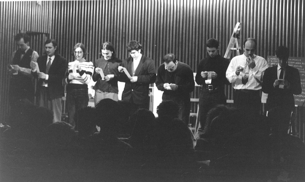 Actuació de la Reflux Orchestra a l’auditori del Museu Tàpies el 29 de gener de 1995. D’esquerra a dreta: Borja Zabala, Joan Casellas, Júlia Montilla, Alexis Tauler, Noel Tatú, Quim Tarrida, Miquel Baixas, Lluís Alabern i Oscar Abril Ascaso.