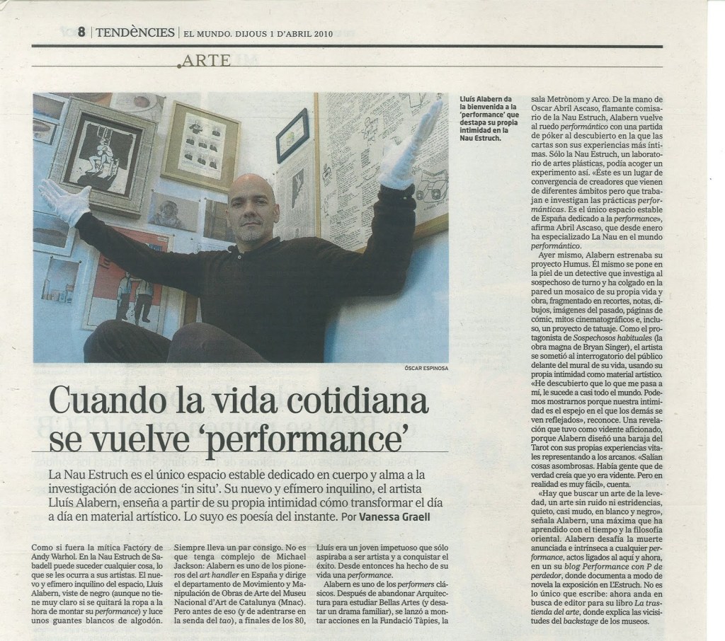 Alabern es uno de los performers clásicos. Después de abandonar Arquitectura para estudiar Bellas Artes (y desatar un drama familiar), se lanzó a montar acciones en la Fundació Tápies, la sala Metrónom y Arco. De la mano de Oscar Abril Ascaso, flamante comisario de la Nau Estruch, Alabern vuelve al ruedo perforrnántico con una partida de póker al descubierto en la que las cartas son sus experiencias más íntimas. Sólo la Nau Estruch, un laboratorio de artes plásticas, podía acoger un experimento así. «Éste es un lugar de convergencia de creadores que vienen de diferentes ámbitos pero que trabajan e investigan las prácticas performánticas. Es el único espacio estable de España dedicado a la performance», afirma Abril Ascaso, que desde enero ha especializado La Nau en el mundo performántico.
